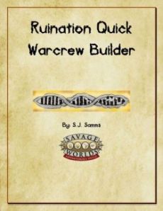 The Ruination Crew Builder is a compilation of all the tables you need to build a warband¸There are no game stats included¸ but all of the point values and for all of the units in the game. This allows you to sit happily and build endless 50-point warbands without having to flip through half-a dozen books or PDF's.