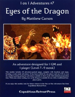 Expeditious Retreat Press announces its seventh title in 1 on 1 Adventures following the award-winning Pleasure Prison of the B'thuvian Demon Whore. 1 on 1 Adventures #7: Eyes of the Dragon is designed for 1 GM and 1 player¸ monk level 7-9. The precious relics of the monastery have been stolen! The PC must leave the serenity of his mountain monastery and travel to foreign lands to track down a thief and bring the Eyes of the Dragon home.
