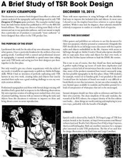 For each publication¸ I've identified margin sizes¸ fonts and font sizes¸ indents¸ table styles¸ head styles¸ and individual entry styles for dungeon rooms¸ spells¸ magic items¸ monsters¸ and class entries. Directions are given for getting the closest available free fonts to match the classic choices¸ and commentary is provided on the sometimes-esoteric page design choices made by TSR's book designers. Given those idiosyncracies¸ I wouldn't recommend anyone replicate the styles in this document exactly¸ but designers who want to do callbacks to classic TSR styles in their own works will find the specifics in this study.