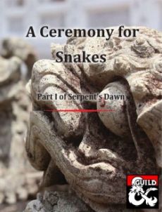 The High Scalespeakeress summons her champions to the Ceremony of the Faithful. As elite Pureblood warriors of Merrshaulk¸ you have waited for this day with great anticipation. It seems your dark ambitions will finally be rewarded… A Three-Hour Adventure for 4th level Yuan-ti. Create Yuan-ti adventurers in this one-shot adventure to give your DM a break and have some evil fun. By Kayleigh McAllister During Part I of this adventure¸ A Ceremony for Snakes¸ the adventurers will receive snake-themed¸ magical weapons during a religious ceremony in honor of their elite status in a cult¸ bid on black market snake god relics at auction¸ and encounter a rival Yuan-ti adventuring party!