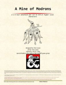 Hi everyone! Here is a low level adventure in a small dungeon for Dungeon Masters with new players or new Dungeon Masters looking for a starting adventure with a dungeon that can be placed anywhere in their campaign. A Mine of Modrons is a relatively short dungeon crawl inside a dwarven mining compound with some leftover treasure that can be discovered. If you like this adventure and wonder if you could run it at a higher level than intended¸ I have a note at the end that offers some ideas that could be swapped in for higher level play or might inspire you to create your own changes. And if you have any adventure creating critiques¸ I would love to hear it so that I can continue to improve! Have fun exploring the dungeon!
