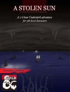 An underground ocean¸ a city of vices¸ and a temple lost to darkness. A Stolen Sun takes inspiration from the game Sunless Sea while setting players off on a traditional D&D adventure. Delving into the Underdark you'll learn about the Torach-El¸ an underground ocean that's teeming with pirates and sea monsters. Tasked with finding an ancient lost temple the characters will fight against encroaching terror. There is a mix of social exploration¸ combat¸ and roleplay choices to resist terror which is slowly driving your character mad. With the small chance of a character losing their mind at the end of the adventure and failing to return from the Underdark. This is an adventure built around high-risk high reward choices. Players will often have a chance to take on a voluntary penalty for a bonus in hopes of it paying off later. This adventure also introduces an optional mechanic called Terror Checks. A gameplay mechanic meant to simulate the oppressive nature of being underground for extended periods of time by adding light mechanical and RP limitation on a character. There are suggestions for scaling up or down combat encounters for more or fewer players and also openings to tie the module into larger campaigns.