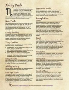 Bored with one and done ability checks? Do you want more options to pit players and npc's against each other out of combat? Want your out of combat challenges to rise and fall like combat? Ability duels are for you. The next in Double Crescent's series of one page drop in rules¸ Ability Duels provides a way to use existing rules in a new way. For DM's and adventure writers¸ they can be an excellent way to add variety and create unique challenges. Released under a Creative Commons 4.0 Attribution International license. Feel free to use it in your own work¸ just attribute Tyson VanOverhill or Double Crescent in your acknowledgements. Check our product page for more one page supplements.
