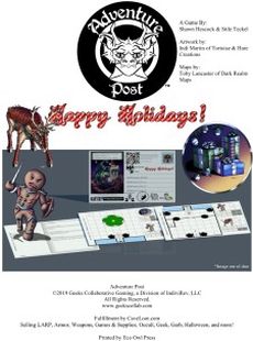 Welcome to Adventure Post¸ the solitary adventure series delivered to your door. We are calling this our "Holiday Teaser" which will introduce you to the concept and the rules of the game. Please enjoy! You are a hero¸ a person with great abilities¸ good temperament¸ a strong heart¸ and an even stronger love for spiked eggnog. As you sit in your favorite fur-covered¸ sheep wool-padded chair¸ alone in the solitude of greatness¸ you hear a series of thuds on your roof¸ followed by what sounds like scratching against the roof tiles. Your neighbor must have lost their griffin again. You decide to round it back up and¸ hopefully¸ you will not need a finger reattachment from the cleric again... You walk out of your cottage¸ it is winter but there's no snow on the ground. Not yet. Climate change has seemed to shift the snow into the early months of the new year (and they say it's a hoax?). Anyway¸ the towering buildings of the bustling city can be seen in the distance to your right¸ it is strange though… you are clearly part of a fantasy world¸ but the cityscape looks quite modern¸ like New York¸ Seattle¸ or Portland. There's no time to dwell on the finer details though¸ you have a griffin to catch! When you look upon your roof¸ you do not see an eagle-lion at all. Rather¸ to your aghast¸ you see a very different creature! Above you¸ holding a bag full of wrapped parcels and decorated from wingtip to tail¸ is Kringle Klaws! You didn't even believe in Kringle but here she is¸ right in front of you. A sack full of gifts and all. What a sight to see! Not only are you shocked that you are beholding Kringle Klaws but you are nearly floored when she starts to speak to you. "Adventurer¸" she says. "Something terrible has happened and I have been forced to seek your aid. I have known of your deeds since that very first piggly-wiggly you saved over in Yazoo and I need your skills. Only you can save our holiday." Knowing that you are too stunned to speak¸ she continues. "Another godly being has come from the land of the Vikings¸ the fiend calls himself ‘Kris.' He has stolen my Red Globe of Illumination and I need you to get it back before the sun sets. Without the globe¸ I cannot deliver the gifts to your fellow humans." You have only the whit to ask "Where?" "I watched him place the globe into a chest strapped to one of his reindeer¸" she says. "I was able to follow the furry beast to a fort in the hills not far from here. There¸ the hooved menace passed by a large illuminated tree and disappeared down some stairs. We need to hurry¸ I am running out of time." With that¸ Kringle jumped down from the roof landing next to you. She beckons you to climb upon her back¸ and you do. As soon as you are settled she leaps into the air¸ wings beating against the wind¸ and she carries you high into the sky.