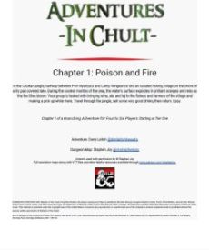 In the Chultan jungle¸ halfway between Port Nyanzaru and Camp Vengeance sits an isolated fishing village on the shore of a lily pad covered lake. Your party is tasked with bringing tej to the fishers and farmers of the village and making a pick up while there. Travel through the jungle¸ sell some very good drinks¸ then return. Easy. Poison and Fire is the first adventure in a branching series based in the jungles of Chult. Political intrigue amonst merchant princes. Disillusioned beggar princes in Old City. Two dragons bent on claiming the same territory. Let's see what secrets the jungle holds.