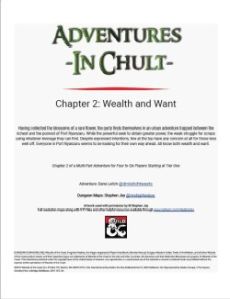 Returning from a simple mission¸ the party find themselves being recruited as pawns in the middle of political infighting. One side wants vengeance. Another side seeks wealth. A third wants nothing more than to maintain the tenuous status quo. Do any involved actually care about the people of Port Nyanzaru? Wealth and Want is the second adventure in a series based in the jungles of Chult. Political intrigue amonst merchant princes. Grifting beggar princes in Old City. Two dragons bent on claiming the same territory. Let's see what secrets the jungle holds as we join in another episode of Adventures in Chult!