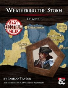 Prove your salt and sail into the eye of the storm. The storm awaits in the ninth adventure of the Across Eberron: Convergence Manifesto adventure path with this adventure for 5th level characters. Written for use with either Eberron: Rising from the Last War or the Wayfinder's Guide to Eberron by Keith Baker. Adventure Summary: Provost Faurious has procured an Aethervane ¸ an astrolabe-like instrument tied to Kythri that's used to navigate manifest zones. Unfortunately for the Provost¸ the Riedran ship that was carrying the Aethervane across the Sea of Rage to deliver it to their agent in Regalport fell victim to piracy. The player characters are dispatched to Regalport to meet up with the Provost's agent there and petition High Prince Rygar for more information about the stolen cargo. When the characters dock in Regalport¸ they meet the Provost's contact and are ushered into a meeting with High Prince Rygar. Wishing to show his intolerance for piracy¸ Rygar charters one of his own ships for the party's use as they investigate the stolen cargo. Upon arriving at the crash site of the stolen cargo¸ the party is set upon by a fleet of pirates known as the Wind Whisperers. When things turn sour¸ a new surprise reveals itself as an unnatural storm rolls in¸ a stolen airship at its heart. The Wind Whisperers have found a way to convert the Aethervane to serve their own purposes. Seeking aid from Rygar and House Lyrandar¸ the heroes chase after the pirates by sail and airship. As they do¸ they are bedeviled by the Chaos Fleet-strange ships sailed by an even stranger crew that are drawn to the Aethervane and the chaos it brings. In a final airborne confrontation¸ the party boards the rogue airship and retrieves the sought-after artifact¸ with a chance to salvage or sink the stolen vessel in the process... Across Eberron (www.acrosseberron.com) is an Eberron community project that aims to tell the stories and exploits of heroic characters in Eberron and introduce players--new and experienced--to the wonderful lore and rich history the setting has to offer. Edited by Will Brolley¸ Wayne Chang¸ and Laura Hirsbrunner¸ along with executive producer Keith Baker. Check out the rest of the Convergence Manifesto season: AE01-01 Fired & Forgotten by Imogen Gingell AE01-02 Live Another Day by Dave Knighton AE01-03 Rime or Reason by David Morris & Anthony Turco AE01-04 Living Legend by Will Brolley & Mark Navarre-Jones AE01-05 Perfect Timing by Derek Myers & Laura Hirsbrunner AE01-06 Night's Gambit by Imogen Gingell AE01-07 The Silvered Edge of Twilight by Ed Chivers & Will Brolley AE01-08 March of Madness by Andrew Bishkinskyi AE01-09 Weathering the Storm by Jarrod Taylor AE01-10 At Death's Door by Patrick Dunning AE01-11 A Heart in Mourning by Chad Justis & Aaron Killeen AE01-12 Lost in Dreams by Nausicaä Enriquez AE01-13 Skyfall by Imogen Gingell¸ Patrick Dunning¸ Jarrod Taylor¸ and Ed Chivers About the Author: Jarrod Taylor has loyally served the Daughters of Sora Kell for over a decade. When he is not consumed in the world of Eberron¸ he can be found in Southern Ohio where he is a manager and projectionist at a movie theater. Jarrod is a Forever DM and has taken great joy in shifting the default setting his players explore to Eberron. He is thankful that his spouse is willing to tolerate his tabletop obsession and frequently joins in on the games Jarrod runs when they both aren't spending time playing dinosaurs with their son. This is his first attempt to bring his Eberron ideas to new players and fans of the setting. Money tight? We're playing it forward¸ no strings attached! If you can't pay¸ we still want you to play! Please support us with whatever you can: Click here for 50% off Click here for 90% off (if you do this¸ it still counts toward our bestseller medals!) Click here for 100% off (it won't count