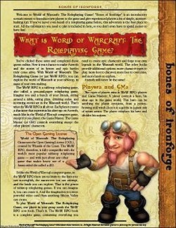 Welcome to World of Warcraft: The Roleplaying Game! Bones of Ironforge is an introductory scenario meant to introduce new players to the game and give experienced players a bit of simple¸ monsterbashing fun. If you've never even heard of a roleplaying game before¸ this adventure is the best place to start. All the information you need to play is included in here¸ so you don't even have to spend money to have fun!"