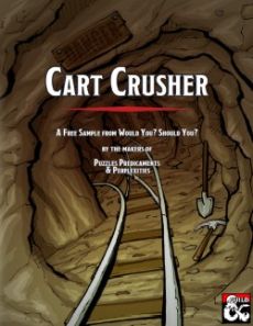 When a dwarven mine cart breaks loose¸ the party has a split second to make a difficult decision - do they redirect it to kill a single dwarf on a side rail¸ or do they let it continue down its current course¸ potentially killing three or more dwarves? Cart Crusher is a free sample encounter from Would You? Should You? a collection of moral dilemmas to present to characters.