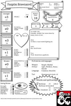Hey¸ adventurer! Having trouble choosing a character for an upcoming game of Dungeons and Dragons 5e? Well why not choose this one? Fargrim the level 3 Dwarf Fighter is a great pick for an adventure with a few friends - all nice and spec'd and equipment'd up¸ ready to go! It's also completely free! Not a fan of this one? Well worry not¸ as I've prepared 11 other characters¸ one from each of the other classes for you to browse through. Check out my other work¸ I'm sure you'll be able to find something you'd enjoy. And yes¸ that fancy custom character sheet is one I made all by myself. It IS rather sweet¸ and comes with the following benefits: - Nice and easy on the eye format. - Skills next to the attributes that govern them¸ giving you an easy idea of what does what. If you don't like the character but want to use this sheet format¸ there's a printable blank copy among my titles too. May it serve you well¸ provided you don't use it to create a murder hobo. That's just not cool. I don't want to be associated with that...