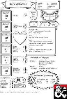 Hey¸ adventurer! Having trouble choosing a character for an upcoming game of Dungeons and Dragons 5e? Well why not choose this one? Kara the level 3 Half-Elf Sorcerer is a great pick for an adventure with a few friends - all nice and spec'd and equipment'd up¸ ready to go! It's also completely free! Not a fan of this one? Well worry not¸ as I've prepared 11 other characters¸ one from each of the other classes for you to browse through. Check out my other work¸ I'm sure you'll be able to find something you'd enjoy. And yes¸ that fancy custom character sheet is one I made all by myself. It IS rather sweet¸ and comes with the following benefits: - Nice and easy on the eye format. - Skills next to the attributes that govern them¸ giving you an easy idea of what does what. - Little cheat-sheet descriptions on spells. If you don't like the character but want to use this sheet format¸ there's a printable blank copy among my titles too. May it serve you well¸ provided you don't use it to create a murder hobo. That's just not cool. I don't want to be associated with that…