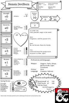 Hey¸ adventurer! Having trouble choosing a character for an upcoming game of Dungeons and Dragons 5e? Well why not choose this one? Nemeia the level 3 Tiefling Wizard is a great pick for an adventure with a few friends - all nice and spec'd and equipment'd up¸ ready to go! Not a fan of this one? Well worry not¸ as I've prepared 11 other characters¸ one from each of the other classes for you to browse through. Check out my other work¸ I'm sure you'll be able to find something you'd enjoy. And yes¸ that fancy custom character sheet is one I made all by myself. It IS rather sweet¸ and comes with the following benefits: - Nice and easy on the eye format. - Skills next to the attributes that govern them¸ giving you an easy idea of what does what. - Little cheat-sheet descriptions on spells. If you don't like the character but want to use this sheet format¸ there's a printable blank copy among my titles too. May it serve you well¸ provided you don't use it to create a murder hobo. That's just not cool. I don't want to be associated with that… Note: This character was levelled up using spells from Xanathar's Guide to Everything.