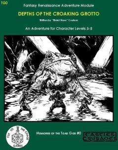 TG0 Depths of the Croaking Grotto is an adventure module for a group of 4 to 6 characters levels 3 to 5. The bulk of the adventure is wilderness-based¸ so at least a character is recommended with strong survival skillsets. The Fell Mountains hold many dangers especially for those who go poking into its deepest depths.
