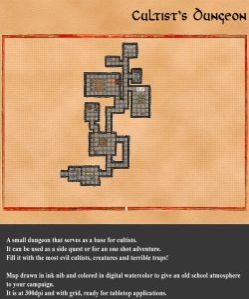 A small dungeon that serves as a base for cultists. It can be used as a side mission or for an one shot adventure. Fill it with the most evil cultists¸ creatures and terrible traps!