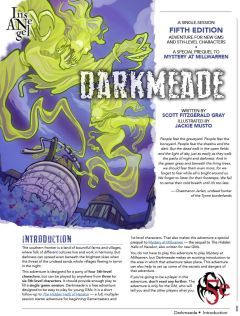 Darkmeade is a FREE adventure for fifth edition fantasy roleplaying¸ written with a special focus on young Gamemasters of ages twelve and up. This one-shot adventure can be played as a sequel to The Hidden Halls of Hazako r and a prequel to the upcoming Mystery at Millwarren. Both those books are written in a friendly and straightforward fashion for new and beginning young GMs¸ offering not just a fun adventure but plenty of tips and advice on running great games.