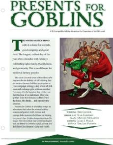 EN5ider 119: Presents for Goblins (5e) Fantasy 🔗 EN Publishing Ellis Goodson Kiel Chenier Universell Abenteuer 🔗 Abenteuer PDF¸ Original electronic EnglischEnglish 2019 Als PDF erhältlich bei DrivethruRPGAvailable as PDF at DrivethruRPG Unterstütze Deinen lokalen Spieleladen vor Ort!Support your local dealer 🔗 DescriptionDescription A 5e-compatible holiday adventure for characters of 3rd-5th level.