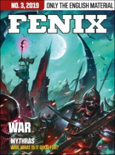 Fenix no 3¸ 2029 has a War theme This issue featured a lot of Swedish only material¸ such as a complete miniature game based on modern military science(!). Alas¸ in English we are happy to feature a really good article by the ever productive and inspiring Pete Nash. War¸ what is it good for - an article for Mythras by Pete Nash Lukas Thelin made the illustration¸ which also is the cover of this issue. War¸ what is it good for? War¸ war never changes... Sorry¸ I had to say it. However¸ it remains fundamental truth. No matter how often wars are fought¸ despite the horrors they bring¸ humanity always returns to conflict. It is an inherent part of the human condition¸ our history¸ and ultimately¸ our future. As such¸ war is usually a fundamental element of most roleplaying settings. Its presence often gives the excuse for why player characters can engage in rampant combat¸ without censure or becoming ostracised. There are few fantasy or sci-fi worlds without some form of military conflict¸ whether against a foreign power or race¸ or fighting against civic dissent. After all¸ who would question men and elves protecting Middle Earth against Sauron's Orcs¸ or defending the rebel alliance against imperial stormtroopers? A roleplaying campaign need not be set in a world with war relegated to the background however. Glen Cook's book series centered on the Black Company is a perfect example of a setting in which the main protagonists are a military unit engaged in the myriad tasks beyond open battle. The stories could form the backbone of any mercenary-based game. Yet endless combat is boring unless your game is merely an evolved game of tactical Battle Chess¸ which at its core¸ is exactly what RPGs started out as. Looking back through my battered collection of AD&D modules¸ it is jarring to see just how much of each page is taken up with combat encounters and statistics… which is fine if you like wargaming¸ but rather tedious if your character cannot leave the army to engage in a little politics¸ adventure or tomb robbing. After all¸ army sergeants are not known for giving 3 days leave for the pursuit of personal business. Thus war¸ whilst a perfect opportunity to allow player characters to engage in legitimate violence¸ should be something which is only brought to the forefront infrequently… at least when it comes to marching them off to some battlefield. In this article we shall investigate some aspects of war from the perspective of the warrior¸ mercenary or soldier. We lack the space to cover the appalling consequences of war¸ the crimes and effects on civilians¸ and even upon soldiers themselves. To illustrate its injustice and horror would require the entire page count of this magazine¸ nor would it lend itself to good gaming material. War is a terrible thing... but it is always our last fallback in the face of evil. Sadly¸ it always will be. Bernard the Barbarian receives a hug - Evelina Rosenius came up with the idea for her father's comic strip featured here. Åke Rosenius is the man behind the sly barbarian in every issue of Fenix.