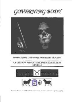 Governing Body (d20) Universell 🔗 Taurus Twelve Jarrod Camire Universell Abenteuer 🔗 Abenteuer PDF¸ Original electronic 24 Seiten EnglischEnglish 2018 Als PDF erhältlich bei DrivethruRPGAvailable as PDF at DrivethruRPG Unterstütze Deinen lokalen Spieleladen vor Ort!Support your local dealer 🔗 DescriptionDescription GOVERNING BODY Murder¸ Mystery¸ And Revenge From Beyond The Grave! A 5 EDITION ADVENTURE FOR CHARACTERS LEVEL 3 A classic tale from Taurus Twelve revised and enhanced for the 5th Edition!
