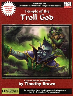 Temple of the Troll God' (33 DM) ist ein D20-Abenteuer für 4-7 Charaktere der 4-6 Stufe von Fast Forward Entertainment. Troll priests are feared among all the Green Races; all of their dark rituals involve living sacrifices to unnamed¸ hideous gods. Could there be something more afoot at their temple to Afnar¸ their black-hearted god of vengeance? Soldiers are gathering in its swampy enclave¸ and strange elves and dragons come and go in the misty twilight. Troll pilgrims bearing chests of gold and gems arrive and never leave. Does the troll god stir? A Green Races Adventure! Goblins¸ trolls¸ ogres and their filthy lot are collectively known among humans as the Green Races. A Green Races adventure takes place far beyond the protection of walled human cities¸ their armies and justice¸ out in lands where fortunes are made with steel and sorcery!