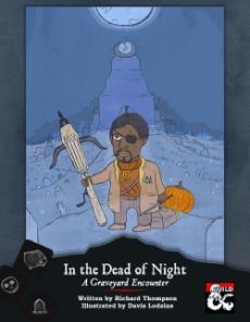 Ah¸ the autumn has finally arrived. The cosy time of falling leaves¸ sparkling campfires and the dead rising from their graves... wait... what? In the Dead of Night ¸ your adventurers are given one simple mission ‐ guard the graveyard during the most dangerous night of the year. As the mystical energies of this hallowed eve converge¸ all things dread and undead become increasingly active. It is on this night that ancient liches seek their misplaced phylacteries¸ ghostly orphans hope to find their long-lost toys¸ and a melancholic vampire contemplates the romance of going out with the sunrise. For adventurers in need of gold and glory¸ it is the busiest night of the year. This is a self-sufficient quest¸ designed for one spooky evening of play ¸ perfect for low-level characters¸ newcomers to the hobby and higher level solo play. It features a list of events¸ which culminate in a boss-fight where you have to protect the one good necromancer hoping to set things right. You can play it as a one-shot¸ or easily include it in any campaign. In the Dead of Night includes the following features: All you need to run a special Halloween game ¸ or a spooky session on any other evening. A list of 20 random encounters for a chilling graveyard shift. Some events are dangerous¸ some humorous¸ all atmospheric. Instructions for a final encounter ‐ protect Disibid the White Necromancer as she finishes her ritual and calms the graveyard spirits. Special¸ hand-drawn Halloween design! The tentative approval of Derick Shadowbanekiller¸ the famed halfing vampire-hunter¸ the grimmest of grimdark heroes.