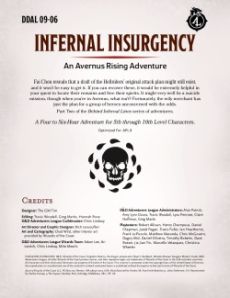Fai Chen reveals that a draft of the Hellriders' original attack plan might still exist¸ and it won't be easy to get it. If you can recover these¸ it would be extremely helpful in your quest to locate their remains and free their spirits. It might very well be a suicide mission¸ though when you're in Avernus¸ what isn't? Fortunately¸ the wily merchant has just the plan for a group of heroes unconcerned with the odds. Part Two of the Behind Infernal Lines series. A Four to Six Hour Adventure for 5th to 10th Level Characters (APL 8)