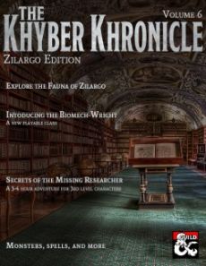 Welcome to The Khyber Khronicle; a collection of encounters and DM tools that can be used to enhance any adventure and player options for existing or new characters. Within this volume includes: The Fauna of Zilargo The Biomech-Wright class! A 3-4 hour adventure Suggested products available on the DM's Guild: