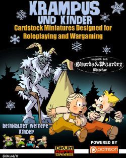 Krampus are horned demonic creatures from German folklore that punish bad children by hitting them with bundles of birch twigs or whips and in some cases put them in a sack and carry them off to hell. Krampus can be a fun addition to any fantasy or modern urban fantasy campaign. Paper minis of Krampus and terrified kids are included in this set as well as a Swords and Wizardry Whitebox compatible write-up.