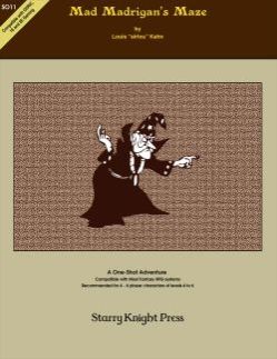 This is a one-shot module designed for use as an evening's worth of adventuring as your players face their imminent demise¸ trapped in a mad gnome illusionist's maze! Lured to the maze by a treasure map and rumours of great fortunes and powerful magick¸ the players soon become prisoners in Madrigan's underground maze. The entire dungeon is on lock-down: the only known exit cannot be reopened and the entire place has been ensorcelled so teleportation¸ æthereal and dimensional spells all fizzle out and fail. The only way the players are getting out is by finding the exit the old fashioned way¸ dungeon delving!
