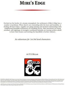 Perched on the border of a steamy swampland¸ the settlement of Mire's Edge has a number of problems. When they're not contending with the heat and humidity¸ or fending off insect bites¸ supplies are going missing and strained relationships with neighboring lizardfolk settlements are frazzling nerves. Now merchants are being attacked¸ and sightings of strangely coordinated kobolds are leaving settlers afraid to leave their homes and inciting the lizardfolk to further violence. An adventure for 1st - 3rd level characters.