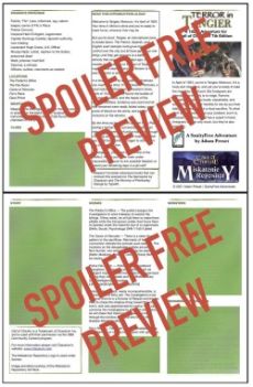 This adventure includes 2 pages of scenario information with locations¸ scenes¸ NPCs¸ and clues to use at the Keeper's discretion. This condensed format is best used by Keepers who have run Call of Cthulhu scenarios before and who need a foundation for their own embellishments.