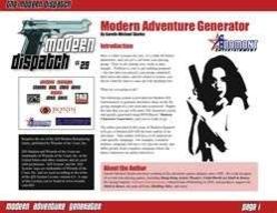This issue of Modern Dispatch provides Gamemasters with a series of tables with which they can generate adventure seeds for any modern d20 campaign.