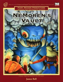 "NeMoren's Vault" is an introductory fantasy roleplaying adventure for use with the d20 system. Included with this adventure are full color character and monster counters¸ full color visual aids and handouts¸ a battle grid¸ and pre-generated characters for "out-of-the-box" action! Also featured are special Runes of Passage that allow you to access adventure related material from secure pages on the internet.