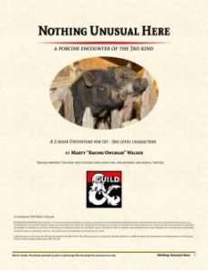 Nothing Unusual Here is a 3 hour UNventure (levels 1 - 3) where nothing bad happens... except for the PCs. This adventure features heavy role playing and may result in a quick demise for murder-hobos. Just in time for Halloween! Marty "Raging Owlbear" Walser releases his debut full length horror scenario. Nothing Unusual Here takes the players through the almost-but-not-quite ordinary hamlet of Mudhole¸ where all of the residents are unusually fond of their pet Dwarf Pigs... so much so that they carry the pigs around with them. Everywhere. All the time. Is this an innocent fad or something far more sinister? (Feedback welcome. Please be kind. Look for me on Twitter: @RagingOwlbear)