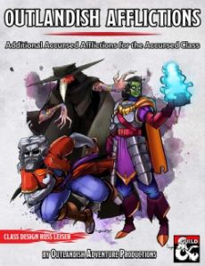 Outlandish Adventure Productions presents: Outlandish Afflictions ¸ two new Metamorphosis paths and six new Accursed Afflictions for OAP's Accursed Class ! Metamorphosis Paths Suppression : Make more and easier use of your ability to suppress the debilitating effects of your ailments! Anathema : Use your curse magic to shut down spells affecting you and your allies! Accursed Afflictions Curse of Combustion : You were afflicted with a fire that burns you from the inside out¸ and that was supposed to eventually cause you to explode before you learned to channel and release your raging inferno. Harnessing your curse¸ you create controlled explosions to watch your foes burn! Curse of the Hunted : You were made to be constantly preyed upon by the beasts and monsters of the multiverse¸ never to feel safe again until you realized that your curse causes aggression. Harnessing your curse¸ you summon creatures to hunt your enemies¸ which then turn on you when the fighting is done! Curse of Immortality : You were cursed to always come back when you died and never to age¸ ensuring you could never have permanent rest. Harnessing your curse's restorative properties you can heal your allies¸ and can use the knowledge and wisdom you've gained from all the lifetimes you've lived to recall old talents! Curse of Invisibility : Your visage and appearance were stolen from you¸ making even you unable to see yourself until you learned that your curse bends light. Harnessing your curse¸ you dodge attacks and exploit the weaknesses in your foes' defenses! Curse of Petrification : You were once permanently turned to stone before you regained awareness and found a way to return to flesh. Harnessing your curse¸ you can enter a stone form that allows you to barrel through your foes! Curse of Plague : You were afflicted with a magical disease that nearly killed you before you found a way to stop and control its spread. Harnessing your curse¸ you develop and contract other magical diseases with which you can infect your enemies! We hope you love these new curses and our Accursed Class as much as we and our players do! We'd love to hear your feedback¸ so please send us any questions or comments you have. Also¸ if you perceive any balance issues¸ please let us know and we will address them as quickly as we can. Update History 10/30/2019 v1.0 - Original file uploaded. And if you enjoy the Accursed Class and its Outlandish Afflictions¸ you might enjoy OAP's other products: The Dracoknight Class The Elementalist Class The Emergent Class The Justiciar Class The Odic Class The Samurai Class The Sculptor Class The Oculus Race The Ratter Race Outlandish Bonds - Additional Draconic Bonds for the Dracoknight Outlandish Elements - An Additional Control Style¸ an Additional Prime Element¸ New Specalities for the Original Prime Elements¸ and 8 Spells for the Elementalist Outlandish Justice - An Additional Judiciary Division and 6 Spells for The Justiciar Outlandish Shape Weapons - Additional Battle Sculpts for The Sculptor Outlandish Sculpting Tools - A Collection of Sculptor-Themed Magic Items Path of the Liver Eater: An Outlandish Commission - A Barbarian Subclass that eats its enemies to gain their power¸ commissioned by David Adams Honor & Devotions: Traditions and Legends of the Far East (Collaboration with David Adams) ‐ A Kara-Tur Character Option Supplement for 5e The Complete Devout Handbook (Collaboration with Sterling Vermin Adventuring Company) ‐ A Collection of Subclasses¸ Spells¸ and Magic Items for the Cleric¸ Druid¸ Monk¸ and Paladin The Complete Martialist Handbook (Collaboration with Sterling Vermin Adventuring Company) ‐ A Collection of Subclasses¸ Equipment¸ Feats¸ and Magic Items for the Barbarian¸ Fighter¸ Ranger¸ and Rogue This is the Outlandish Adventure Productions philosophy