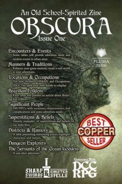 Obscura is a zine about the old school spirit in RPGs. Here we'll talk about games like DCC RPG ¸ Sharp Sword and Sinister Spells ¸ Solar Blades & Cosmic Spells ¸ Dark Streets & Darker Secrets ¸ bring to us new rules¸ monsters¸ tables¸ spells¸ etc.¸ and we hope¸ so many other games that focus on this classic style of gaming.