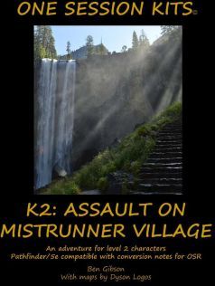 K2: Assault on Mistrunner Village is a stealth or combat mission designed for player characters around 2nd level. In it¸ the players are thrown into a tumultuous conflict in a remote cliffside dwarf village¸ arriving at Mistrunner Village as an unscrupulous band of raiders led by an obsessive magician enact their assault. The players are offered the village's treasures if they aid against the bandits¸ but there is an second threat up at the top of the village falls; a desperate shaman is scrambling to awaken the ancient guardians of the falls¸ little knowing that the gargoyles he'll bring forth will try to kill villager and raider alike.