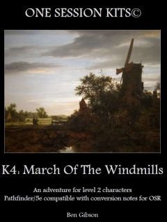 K4: March of the Windmills is a social and traveling adventure built for characters of 2nd level¸ where the players work to thwart the mad schemes of Dolceo the Miller¸ who has begun a rampage upon the countryside using his animated windmill. The players will need to discover why the crazed miller is on his rampage and how he's animating the windmill. Then¸ the players will have to race to reach the mobile building and rescue the miller's victims before he reaches the next village in his path.
