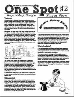 One Spot #2 presents a bookstore called Angar's Magic Shoppe¸ complete with a bookseller (the height-challenged but brilliant Angar Bossz)¸ store map¸ images¸ and more. One Spot #2: Angar's Magic Shoppe is another great tool to include in your bag of GM tricks!