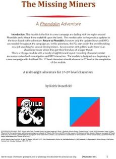 Phandalin: The Missing Miners is a new campaign that builds off of information in the module Phandalin: Return to Phandalin ¸ which details the town several months after the events found in the boxed set Lost Mines of Phandelvar by Wizards of the Coast. This new adventure series takes place in and around the town building on information and NPCs to create a new plot involving serpentfolk trying to infiltrate the region. This first adventure has the PCs rescuing miners that are being kidnapped by local goblins. The PCs follow the trail to an old border tower containing the miners and find their first clues to a larger threat. This module is designed as a first in a new campaign. Having the boxed set and Return to Phandalin will aid you to play¸ but are not truely needed. This adventure is 10 pages in length and designed for 1st level play.