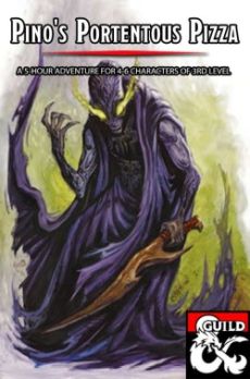 Pino's Portentous Pizza takes place in the small town of Benecia in the wake of a gruesome murder. The players will be called to investigate and work out what happened: was Pino - the gratest pizzaiolo - killed by Pignazza - his main competitor - or is something else going on? A life hangs in the balance and it's up to the party to save the day. This adventure is divided in three parts. In the first scene¸ the party has to navigate the town of Benecia¸ interrogate people¸ and investigate. The second scene takes place in Redwood: will the heroes manage to make their way through the monster-infested woodlands to find the culprit? Finally¸ in the third scene¸ the party has to survive the hazards of the murderer's dungeon and deal with them once and for all. This adventure is intended for 4-6 characters of 3rd level and includes a homebrew devil as the party's main opponent and a homebrew consumable magical item: Pino's Portentous Pizza.