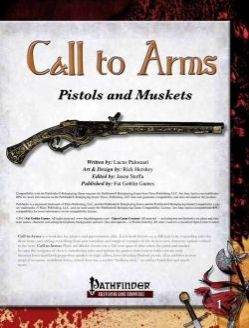 Call to Arms is a book line for players and gamemasters alike. Each book focuses on a different item¸ expanding rules for those items and adding everything from new mundane and magical examples of the item to new character options related to the item. Call to Arms: Pistols and Muskets focuses on a 350 year span of time when the pistol and musket became the weapons of choice¸ introducing rules and options for gamers that want to build custom early firearms from matchlock pepperbox muskets to high caliber¸ breechloading flintlock pistols¸ all in addition to new magical weapons¸ wondrous items¸ cursed firearms¸ a mythic "walking stick¸" an artifact bandolier and much more.