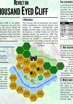 The thousand-eyed cliff is an 800m high fall filled with many caves. At the top of the cliff¸ the rich city of men¸ Rockhaze. Below¸ the dwarf village of Bun Shatûr. For decades¸ dwarves have been living under the diktat imposed on them by men and are forced to give back the wealth resulting from mining. But this fragile balance is in danger of being upset: a mysterious monk is spreading libertarian ideas. What's more¸ the interior of the mountain harbours dangers that are ready to awaken.