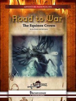 Road to War: The Equinox Crown is an adventure for 6th-level characters waging war against the fiendish powers dominating the fallen druid kingdom of the north. Holy crusaders march into enemy territory to recapture a location of vital strategic importance¸ and Road to War gives you a collection of encounters and scenarios to augment the scope and flavor of the existing adventures¸ replacing tedious random encounters and monotonous overland journeys with exciting and evocative events. These scenarios can be played independently or linked into a unique subplot to recover the legendary Equinox Crown¸ a relic of the ancient druidical circles that will come in very handy later in the campaign as they face down the Locust Lord and his swarming hosts. This item forms a key touchstone for many (though not all) of the encounters in Road to War¸ and it is designed to grow in power alongside the PCs as they rise to become mythic heroes in their own right¸ standing in the breach in a war the world dare not lose. Keep your faith and your sword ready¸ and set out on the Road to War!