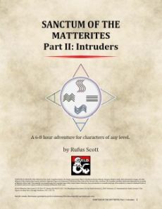 The elemental adventure continues... Sanctum of the Matterites is a Dungeons & Dragons adventure using the 5th Edition rules. It is designed to be played by a party of adventurers at any level. This adventure can be treated as a singular campaign lasting up to 8 hours¸ or easily incorporated into a larger campaign. This is part 2 of a 3 part adventure ¸ though it can be played independently. The Matterites once used their Sanctum to study and experiment on the elements of creation. They were deeply fascinated by the Elemental Planes and the powers they possess. The Matterites are gone¸ and their Sanctum is overrun by elemental creatures and mulfunctioning magics. This guide features an unique adventure that combines battles with elementals and puzzle solving. The aim of this adventure is to eliminate the elemental invaders and reset the Sanctum¸ in order to retrieve treasures that have been hidden behind a lockdown that has lasted a millenia. This guide provides a Dungeon Master with almost everything they need to carry out an adventure filled with elemental dangers and bizarre dungeon environments. Stats from the Monster Manual are required for certain encounters¸ whilst the guide also provides unique monsters in the appendix. This guide also includes instructions and suggestions on how to adjust this adventure for parties of any level. Have a Great Adventure!
