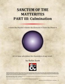The finale of the elemental adventure. Sanctum of the Matterites is a Dungeons & Dragons adventure using the 5th Edition rules. It is designed to be played by a party of adventurers at any level. This adventure can be treated as a singular campaign lasting at least 12 hours¸ or easily incorporated into a larger campaign. This is part 3 of a 3 part adventure ¸ though it can be played independently. The Matterites once used their Sanctum to study and experiment on the elements of creation. They were deeply fascinated by the Elemental Planes and the powers they possess. They are gone now¸ but the Sanctum still has some suprises locked away. The reward for completing the combat and skill-based challenges of this adventure is an enticing one - the Matterites left behind a Portal that can seemingly teleport to anywhere on the Material and Elemental Planes! It won't be easy to gain access. The ancient order made sure that only the strongest and brightest will prevail. This guide provides a Dungeon Master with almost everything they need to carry out an adventure filled with elemental dangers and bizarre dungeon environments. The monster stats at the back of the guide are the only ones you will need. They are already scaled for parties at different levels too. There are simple instructions on how to adjust this adventure for parties at level 1 through to level 20. Have a Great Adventure!