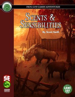Scents and Sensibilities is a three-part resource for those who choose to challenge their players with the foul-smelling monsters known as stank hogs. The first section is a short adventure called The Manufactory of Fumario¸ and the second section is an erudite discussion of the stank hog (Sus noxium). The third section contains statistics for adult and young stank hogs.