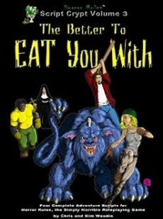 Out Of the Frying Pan¸ Into the Stomach Haven't had your bellyfull of Horror Rules madness?! You're in luck! We're serving up four brand new adventure Scripts for you favorite little five-star horror-comedy RPG! The premise behind this supplement is simple: everything in it is trying to eat you. As you flip through the book¸ you'll quickly discover that the title " The Better to Eat You With " is not just a casual¸ whimsical reference to a popular fairy tale - it's a solid game plan¸ and all the Bad Guys in these scripts are 100% behind it and lining up for dinner. This Script Crypt is a collection of fearsome monsters and fiendish baddies with a taste for human flesh¸ and it's just plain chock full of big teeth¸ big appetites and big digestive tracts. The only thing little about it is your Players' chance of survival. For those who dare to walk this perilous way¸ the dangers are obvious and the margin of victory narrow. The only way to survive is to make the Bad Guys dead before they make you dinner. So get ready for some gutsy¸ no-holds-barred¸ straight up Horror Rules action¸ and brace yourself to burn through those Character sheets like never before. But take heart - you can't make an omelet without breaking a few eggs. Unless you're the Bad Guys¸ of course¸ in which case that's a pretty good start... Four Complete Adventures! Each Script is a complete adventure¸ including all the classic Horror Rules elements: Story¸ Bad Guys¸ Cast¸ Walk-Ons¸ Chain of Events... even Mood tips and Plot Pushers! Also¸ with expanded Sequel Suggestions and Plot Twists¸ each gripping and terrifying Script becomes four Scripts - that's 16 times the mayhem! Packed with all the wacky scares¸ edge-of-your-seat action and pee-your-pants thrills you've come to love¸ this book is a sure hit and a must-have supplement for horror enthusiasts and gaming fans alike. So snap it up today and get ready to sink your teeth into some good old fashioned mayhem... Packed With Horrible Goodies The Better To Eat You With is loaded with goodies¸ including: * 16 Reusable Bad Guys * 15 Reusable Cast * Plenty of Walk-Ons * Plot Pushers for each Script * Sequel Suggestions for each Script Includes These Scripts (Also Available Individually on RPGNow): * Midnight Snack * Recyclers 2 - School Lunch * The Trail to Napawekka Lake * Day of the Monsters