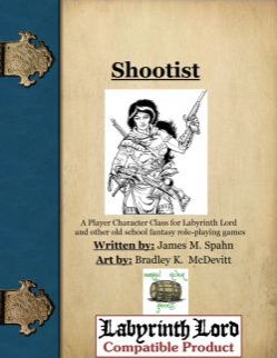 With the Shootist you'll bring the danger and excitement of black powder weapons to your Labyrinth Lord game! This full 15-level player character class adds to your arsenal of weapons and options as you delve the dungeons of your favorite old-school fantasy role-playing game!