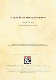 Recently¸ students of the Ismeri Library have been cheating their exams using an intelligence enhancing drug. The drug's origin is unknown¸ but something must be done to stop it! Singer shots for the students is a 3-5 hour adventure set in the city of Ravnica. It is written for a balanced party of 4-6 first level players¸ but as the adventure is largely story- and roleplay driven¸ it can easily be added to an existing campaign with parties of different size and level. This adventure is the first in a series of adventures revolving around an Orzhov beholder trying to take control of the Blistercoils. The adventure's ending can however easily be modified to not continue after the final encounter. Singer shots for the students includes: Adventure introductions for each guild A full statblock and background of the adventure's villain and his companions Maps for locations unique to the adventure A plot hook for further adventures A seperate document with my notes on the campaign and some general advice Part 2