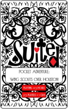 Wing Scouts over Houston is a pre-written adventure that takes place in late-1950's United States of America after a disease causes all of the males in the nation over 16 years of age to turn into nocturnal¸ flesh-devouring Ratmen. During a routine scouting mission¸ an aerial scout was forced to make a crash landing in Houston¸ Texas. Your job is to get her out of there before the Ratmen get her! Wing Scouts over Houston is played using the rules located in Suited: Free Sample Edition and the character creation playset from Suited: Fight the Zombiearchy stand-alone release¸ both of which are available on DrivethruRPG. Players may randomly create characters like normal or use the pre-generated Wing Scout characters for this adventure.